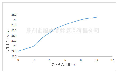 從圖中可以看出,隨著高透滑石粉含量的增加,聚丙烯塑料的拉伸強度逐漸增大,這說明加入高透滑石粉可提高聚丙烯材料的拉伸強度。