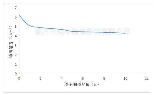 從圖中可以看出,滑石粉添加量為1%時,沖擊強度有個階梯式的下降,之后隨著滑石粉含量的增加,聚丙烯材料的沖擊強度下降緩慢,當添加量為5%時,聚丙烯材料的沖擊強度基本不變化。