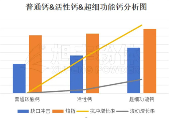以下為經過改性后超細功能碳酸鈣與普通碳酸鈣和活性鈣的力學性能差異性,超細功能碳酸鈣在抗沖性能與流動性方面相比普通碳酸鈣有明顯優勢。在滿足性能的前提下,可減少配方體系中POE添加量,降低配方綜合成本。