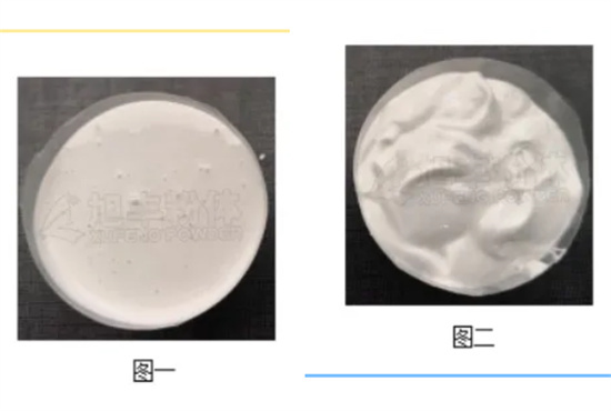 由于(攪拌或搖動)其粘度即降低的流動性質,稱為觸變性。可以通過粉體表面改性提高涂料體系的觸變值。由于有觸變特性,當涂刷較厚時不會出現流掛現象,同時有儲存穩定性好等優點。(以下為改性前后的數據對比,圖一為1250目重鈣,圖二為DXC系列改性粉體)