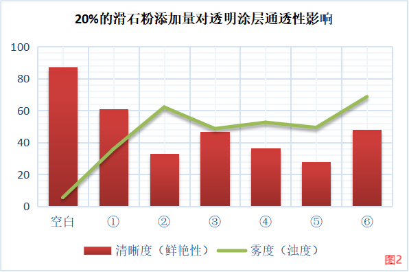 綜上①滑石粉具有明顯優異于其他滑石粉的透明性,同時在高比例下仍可保持較優異的清晰度和低霧度,可見①滑石粉為透明級滑石粉,比一般滑石粉更適用于如木器涂料的透明體系中。