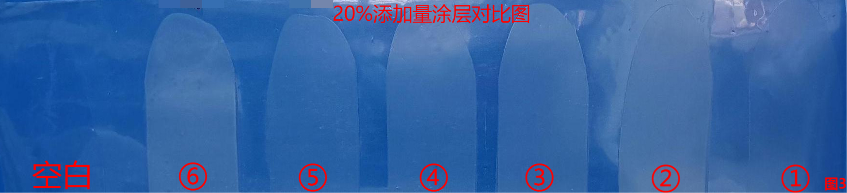 同時使用霧度儀ASTM標準,測試400-700nm波長下,添加20%滑石粉涂層的霧度(濁度)和清晰度(鮮艷性)如上圖2,①滑石粉在20%添加比例下仍可以保持較好的清晰度,對涂層的濁度外觀影響較小;整體的外觀情況如下圖3。